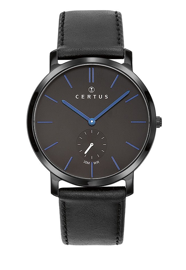 Cette montre Certus pour homme affiche un style épuré ultra moderne, dans l'air du temps, pour un look rock total noir. Ce modèle est doté d'un bracelet noir en cuir véritable, avec surpiqûres apparentes ton sur ton et d'un boitier en PVD noir. Son jeu d'aiguilles et d'indexes sont d'un joli bleu métallisé, très tendance.